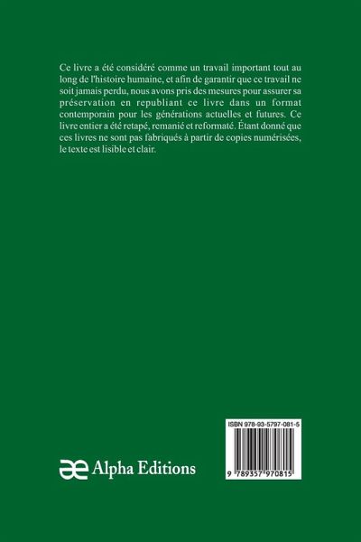 La fabrique de crimes, un livre classique et rare qui a été considéré comme essentiel tout au long de l'histoire de l'humanité, pour que cet ouvrage ne soit jamais oublié, nous chez Alpha Editions avons fait des efforts pour sa préservation en rééditant ce livre dans un format moderne pour les générations présentes et futures. Tout ce livre a été reformaté, retapé et conçu. Ces livres ne sont pas constitués de copies numérisées de leur ¿uvre originale et le texte est donc clair et lisible.