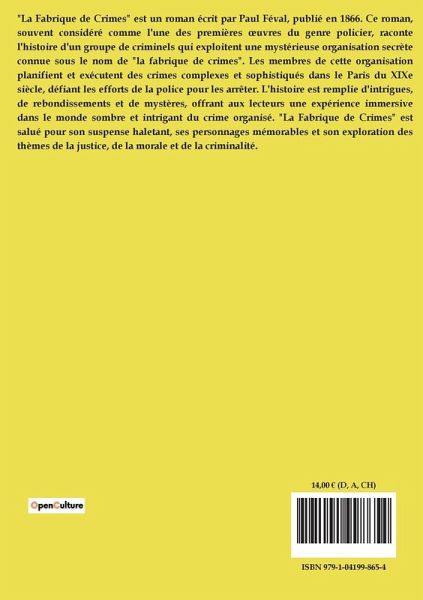 "La Fabrique de Crimes" est un roman écrit par Paul Féval, publié en 1866. Ce roman, souvent considéré comme l'une des premières ¿uvres du genre policier, raconte l'histoire d'un groupe de criminels qui exploitent une mystérieuse organisation secrète connue sous le nom de "la fabrique de crimes". Les membres de cette organisation planifient et exécutent des crimes complexes et sophistiqués dans le Paris du XIXe siècle, défiant les efforts de la police pour les arrêter. L'histoire est remplie d'intrigues, de rebondissements et de mystères, offrant aux lecteurs une expérience immersive dans le monde sombre et intrigant du crime organisé. "La Fabrique de Crimes" est salué pour son suspense haletant, ses personnages mémorables et son exploration des thèmes de la justice, de la morale et de la criminalité.