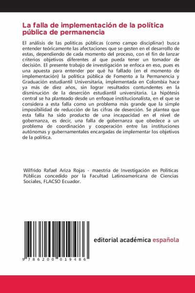 El análisis de las políticas públicas (como campo disciplinar) busca entender teóricamente las afectaciones que se gesten en el desarrollo de estas, dependiendo de cada momento del proceso, con el fin de lanzar criterios objetivos diferentes al que pueda tener un tomador de decisión. El presente trabajo de investigación se enfoca en eso, pues es una apuesta para entender por qué ha fallado (en el momento de implementación) la política pública de Fomento a la Permanencia y Graduación estudiantil Universitaria, implementada en Colombia hace ya más de diez años, sin lograr resultados contundentes en la disminución de la deserción estudiantil universitaria. La hipótesis central se ha planteado desde un enfoque institucionalista, en el que se considera a esta falla como un problema más grande que la simple imposibilidad de reducción de las cifras de deserción. Se plantea que esta falla ha sido producto de una incapacidad en el nivel de gobernanza, es decir, una falla de gobernanza que obedece a un problema de coordinación y cooperación entre las instituciones autónomas y gubernamentales encargadas de implementar los objetivos de la política.