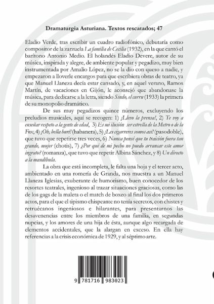 Eladio Verde, tras escribir un cuadro radiofónico, debutaría como compositor de la zarzuela "La familia de Cecilia" (1932), en la que cantó el barítono Antonio Medio. El holandés Eladio Devere, autor de su música, inspirada y alegre, de ambiente popular y pegadizo, muy bien instrumentada por Amalio López, no se la dio con queso a nadie, y empezaron a lloverle encargos para que escribiera obras de teatro, ya que Manuel Llaneza decía estar cansado, y, en aquel verano, Ramos Martín, de vacaciones en Gijón, le aconsejó que abandonase la música, para dedicarse a la letra, siendo "Sindo, el curru" (1933) la primera de su monopolio dramático. De sus muy pegadizos quince números, excluyendo los preludios musicales, aquí se recogen: 1) ¡Llevo la prensa!, 2) Te voy a enseñar respeto a la gente de edad, 3) Es mi ilusión ser estrella de la Metro o de la Fox, 4) ¡Oh, bella hurí! (habanera), 5) ¡Les cigarreres somos así! (pasodoble), que tuvo que repetirse tres veces, 6) Nunca pensé que tu traición fuera tan grande, mujer (chotis), 7) ¿Por qué de mi pecho no puedo arrancar este amor ingrato? (romanza), que tuvo que repetir Albina Sánchez, y 8) Un directo a la mandíbula. La obra que está incompleta, le falta una hoja y el tercer acto, ambientado en una romería de Granda, nos muestra a un Manuel Llaneza Iglesias, exuberante de humorismo, buen conocedor de los resortes teatrales, ingenioso al trazar situaciones graciosas, como las de los gags de la maleta o el match de boxeo al final los dos primeros actos, para el que el tipismo chispeante no tenía secretos, con chistes y retruécanos ingeniosos e hilarantes, para presentarnos las desavenencias entre los miembros de una familia, en segundas nupcias, y los amores de una hija de ésta, aunque algo recargada de elementos accidentales, que la alargan en exceso. En ella hay referencias a la crisis económica de 1929, y al séptimo arte.