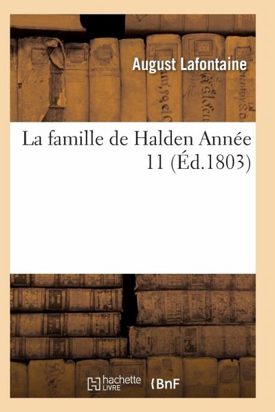La famille de Halden. Année 11, Tome 3 /, traduit de l'allemand d'Auguste Lafontaine par M. V. Date de l'édition originale: 1803 Titre original: Die Familie von Halden Le présent ouvrage s'inscrit dans une politique de conservation patrimoniale des ouvrages de la littérature Française mise en place avec la BNF. HACHETTE LIVRE et la BNF proposent ainsi un catalogue de titres indisponibles, la BNF ayant numérisé ces oeuvres et HACHETTE LIVRE les imprimant à la demande. Certains de ces ouvrages reflètent des courants de pensée caractéristiques de leur époque, mais qui seraient aujourd'hui jugés condamnables. Ils n'en appartiennent pas moins à l'histoire des idées en France et sont susceptibles de présenter un intérêt scientifique ou historique. Le sens de notre démarche éditoriale consiste ainsi à permettre l'accès à ces oeuvres sans pour autant que nous en cautionnions en aucune façon le contenu. Pour plus d'informations, rendez-vous sur www.hachettebnf.fr