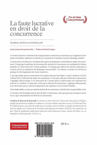 Les fautes lucratives constituent des manquements au droit de la concurrence qui rapportent à leur auteur un bénéfice supérieur au coût lié au versement de l'amende et/ou des dommages-intérêts. L'auteur met en évidence les incitations des agents économiques à enfreindre les règles de concurrence. Il interroge la politique de dissuasion des autorités de concurrence en soulignant les limites attachées à l'intervention de l'action publique. Il souligne par ailleurs les lacunes inhérentes à l'action privée en réparation du dommage concurrentiel. Ces limites et lacunes favorisent en pratique le développement des fautes lucratives. L'ouvrage plaide pour la construction d'un régime dissuasif par étapes, visant à renforcer à la fois l'effectivité et l'efficacité des règles de concurrence. D'une part, afin que le droit de la concurrence s'applique effectivement, il est nécessaire de s'assurer que le contrevenant soit confronté aux coûts de sa violation. D'autre part, afin que le droit de la concurrence s'applique efficacement, il est nécessaire que le coût du manquement soit supérieur à son éventuel bénéfice. Cette étude inédite se situe au carrefour du droit de la concurrence et du droit de la responsabilité civile. L'ouvrage a été récompensé par le prix de thèse Concurrences ainsi que par le prix Jacques Lassier de la Ligue internationale du droit de la concurrence.