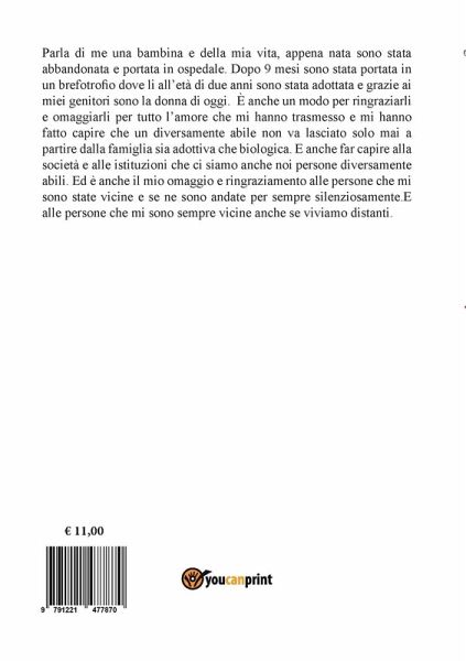 Parla di me una bambina e della mia vita, appena nata sono stata abbandonata e portata in ospedale. Dopo 9 mesi sono stata portata in un brefotrofio dove li all'età di due anni sono stata adottata e grazie ai miei genitori sono la donna di oggi. È anche un modo per ringraziarli e omaggiarli per tutto l'amore che mi hanno trasmesso e mi hanno fatto capire che un diversamente abile non va lasciato solo mai a partire dalla famiglia sia adottiva che biologica. E anche far capire alla società e alle istituzioni che ci siamo anche noi persone diversamente abili. Ed è anche il mio omaggio e ringraziamento alle persone che mi sono state vicine e se ne sono andate per sempre silenziosamente.E alle persone che mi sono sempre vicine anche se viviamo distanti.