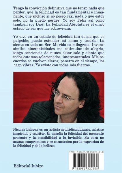 Tengo la convicción definitiva que no tengo nada que perder, que la felicidad es tan fundamental e inmanente, que incluso si no poseo casi nada o que estoy solo, no la puedo perder. Yo soy Feliz así como también soy Dios. La Felicidad Absoluta es el único estado de ser que me sobrevivirá. Yo vivo en un estado de felicidad tan densa que es palpable; puedo extender mi mano y tocarla. La siento en todo mi Ser. Mi vida es milagrosa. Inverosímiles sincronicidades me estimulan de alegría, tengo conciencia de nunca estar solo y siento que todos estamos relacionados, interconectados. Mis recuerdos se vuelven claros, penetro en el tiempo, los hago vibrar. Yo existo con todas mis fuerzas.