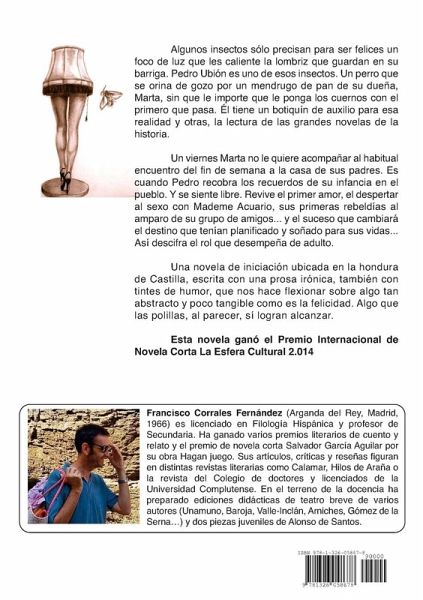 Novela Ganadora del Premio Internacional de Novela Corta La Esfera Cultural 2014. Algunos insectos sólo precisan para ser felices un foco de luz que les caliente la lombriz que guardan en su barriga. Pedro Ubión es uno de esos insectos. Un perro que se orina de gozo por un mendrugo de pan de su dueña, Marta, sin que le importe que le ponga los cuernos con el primero que pasa. Un viernes Marta no le quiere acompañar al habitual encuentro del fin de semana a la casa de sus padres. Es cuando Pedro recobra los recuerdos de su infancia en el pueblo. Y se siente libre. Revive el primer amor, el despertar al sexo con Mademe Acuario, sus primeras rebeldías al amparo de su grupo de amigos... y el suceso que cambiará el destino que tenían planificado y soñado para sus vidas... Escrita con una prosa irónica, también con tintes de humor, nos hace reflexionar sobre algo tan abstracto y poco tangible como es la felicidad. Algo que las polillas, al parecer, sí logran alcanzar.