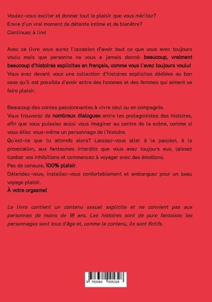 Voulez-vous exciter et donner tout le plaisir que vous méritez?Envie d'un vrai moment de détente intime et de bienêtre?Continuez à lire!Avec ce livre vous aurez l'occasion d'avoir tout ce que vous avez toujours voulu mais que personne ne vous a jamais donné: beaucoup, vraiment beaucoup d'histoires explicites en français, comme vous l'avez toujours voulu!Vous avez devant vous une collection d'histoires explicites dédiées au bon sexe qu'il est possible d'avoir entre des hommes et des femmes qui aiment se faire plaisir. Beaucoup des contes passionnantes à vivre seul ou en compagnie.Vous trouverez de nombreux dialogues entre les protagonistes des histoires, afin que vous puissiez aussi vous imaginer au centre de la scène, comme si vous étiez vous-même un personnage de l'histoire.Qu'est-ce que tu attends alors? Laissez-vous aller à la passion, à la provocation, aux fantasmes interdits que vous avez toujours eus, laissez tomber vos inhibitions et commencez à voyager avec des émotions.Pas de censure, 100 pour 100 de plaisir.Détendez-vous, installez-vous confortablement et embarquez pour un beau voyage plaisir.À votre orgasme!