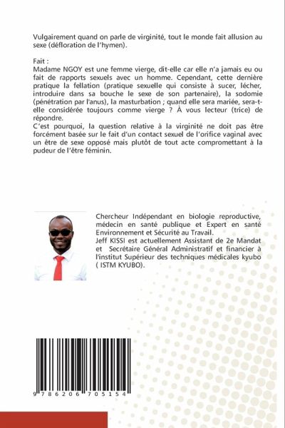 Vulgairement quand on parle de virginité, tout le monde fait allusion au sexe (défloration de l'hymen). Fait : Madame NGOY est une femme vierge, dit-elle car elle n'a jamais eu ou fait de rapports sexuels avec un homme. Cependant, cette dernière pratique la fellation (pratique sexuelle qui consiste à sucer, lécher, introduire dans sa bouche le sexe de son partenaire), la sodomie (pénétration par l'anus), la masturbation ; quand elle sera mariée, sera-t-elle considérée toujours comme vierge ? À vous lecteur (trice) de répondre.C'est pourquoi, la question relative à la virginité ne doit pas être forcément basée sur le fait d'un contact sexuel de l'orifice vaginal avec un être de sexe opposé mais plutôt de tout acte compromettant à la pudeur de l'être féminin.