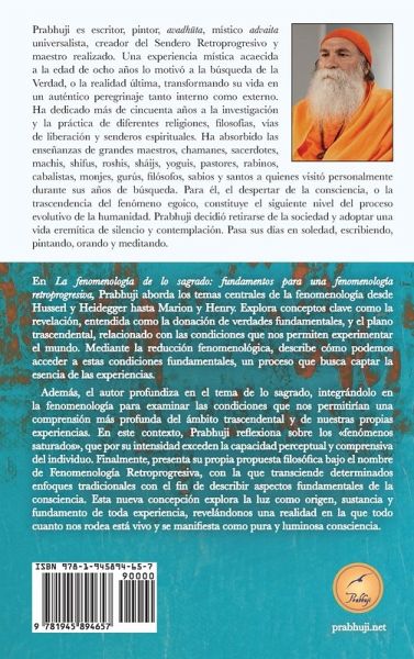 En La fenomenología de lo sagrado: fundamentos para una fenomenología retroprogresiva, Prabhuji aborda los temas centrales de la fenomenología desde Husserl y Heidegger hasta Marion y Henry, explorando conceptos clave como la revelación, entendida como la donación de verdades fundamentales, y el plano trascendental, relacionado con las condiciones que nos permiten experimentar el mundo. Mediante la reducción fenomenológica, describe cómo podemos acceder a estas condiciones fundamentales, un proceso que busca captar la esencia de las experiencias. Además, el autor profundiza en el tema de lo sagrado, integrándolo en la fenomenología para examinar las condiciones que nos permitirían una comprensión más profunda del ámbito trascendental y de nuestras propias experiencias. En este contexto, Prabhuji reflexiona sobre los fenómenos saturados, que por su intensidad exceden la capacidad perceptual y comprensiva del individuo. Finalmente, presenta su propia propuesta filosófica bajo el nombre de Fenomenología Retroprogresiva, con la que transciende determinados enfoques tradicionales con el fin de describir aspectos fundamentales de la consciencia. Esta nueva concepción explora la luz como origen, sustancia y fundamento de toda experiencia, revelándonos una realidad en la que todo cuanto nos rodea está vivo y se manifiesta como pura y luminosa consciencia.