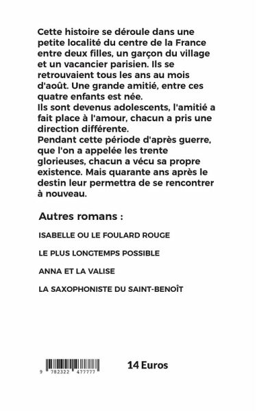 Cette histoire se déroule dans une petite localité du centre de la France entre deux filles, un garçon du village et un vacancier parisien. Ils se retrouvaient tous les ans au mois d'août. Une grande amitié, entre ces quatre enfants est née. Ils sont devenus adolescents, l'amitié a fait place à l'amour, chacun a pris une direction différente. Pendant cette période d'après guerre, que l'on a appelée les trente glorieuses, chacun a vécu sa propre existence. Mais quarante ans après le destin leur permettra de se rencontrer à nouveau.