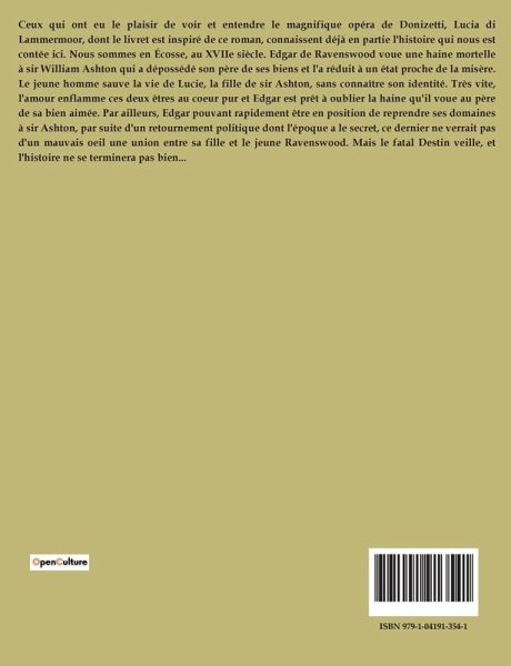 Ceux qui ont eu le plaisir de voir et entendre le magnifique opéra de Donizetti, Lucia di Lammermoor, dont le livret est inspiré de ce roman, connaissent déjà en partie l'histoire qui nous est contée ici. Nous sommes en Écosse, au XVIIe siècle. Edgar de Ravenswood voue une haine mortelle à sir William Ashton qui a dépossédé son père de ses biens et l'a réduit à un état proche de la misère. Le jeune homme sauve la vie de Lucie, la fille de sir Ashton, sans connaître son identité. Très vite, l'amour enflamme ces deux êtres au coeur pur et Edgar est prêt à oublier la haine qu'il voue au père de sa bien aimée. Par ailleurs, Edgar pouvant rapidement être en position de reprendre ses domaines à sir Ashton, par suite d'un retournement politique dont l'époque a le secret, ce dernier ne verrait pas d'un mauvais oeil une union entre sa fille et le jeune Ravenswood. Mais le fatal Destin veille, et l'histoire ne se terminera pas bien...