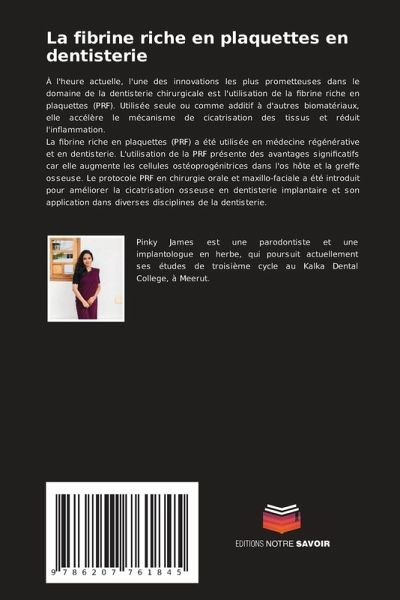 À l'heure actuelle, l'une des innovations les plus prometteuses dans le domaine de la dentisterie chirurgicale est l'utilisation de la fibrine riche en plaquettes (PRF). Utilisée seule ou comme additif à d'autres biomatériaux, elle accélère le mécanisme de cicatrisation des tissus et réduit l'inflammation.La fibrine riche en plaquettes (PRF) a été utilisée en médecine régénérative et en dentisterie. L'utilisation de la PRF présente des avantages significatifs car elle augmente les cellules ostéoprogénitrices dans l'os hôte et la greffe osseuse. Le protocole PRF en chirurgie orale et maxillo-faciale a été introduit pour améliorer la cicatrisation osseuse en dentisterie implantaire et son application dans diverses disciplines de la dentisterie.
