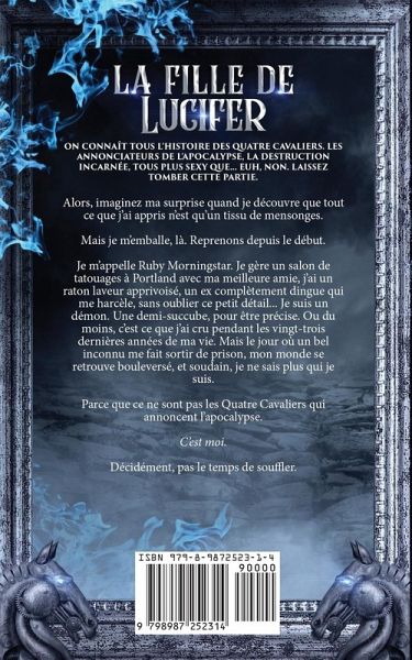 On connaît tous l'histoire des Quatre Cavaliers. Les annonciateurs de l'apocalypse, la destruction incarnée, tous plus sexy que... euh, non. Laissez tomber cette partie. Alors, imaginez ma surprise quand je découvre que tout ce que j'ai appris n'est qu'un tissu de mensonges. Mais je m'emballe, là. Reprenons depuis le début. Je m'appelle Ruby Morningstar. Je gère un salon de tatouages à Portland avec ma meilleure amie, j'ai un raton laveur apprivoisé, un ex complètement dingue qui me harcèle, sans oublier ce petit détail... Je suis un démon. Une demi-succube, pour être précise. Ou du moins, c'est ce que j'ai cru pendant les vingt-trois dernières années de ma vie. Mais le jour où un bel inconnu me fait sortir de prison, mon monde se retrouve bouleversé, et soudain, je ne sais plus qui je suis. Parce que ce ne sont pas les Quatre Cavaliers qui annoncent l'apocalypse. C'est moi. Décidément, pas le temps de souffler.