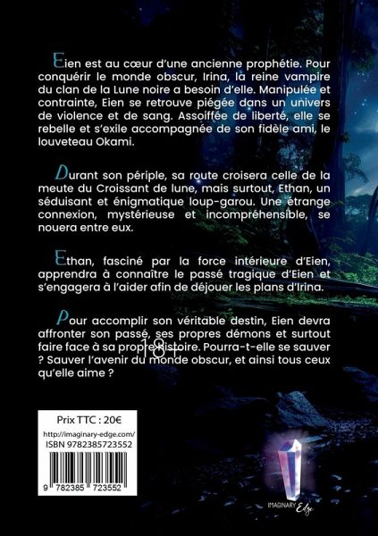 Eien est au cur d'une ancienne prophétie. Pour conquérir le monde obscur, Irina, la reine vampire du clan de la Lune noire a besoin d'elle. Manipulée et contrainte, Eien se retrouve piégée dans un univers de violence et de sang. Assoiffée de liberté, elle se rebelle et s'exile accompagnée de son fidèle ami, le louveteau Okami. Durant son périple, sa route croisera celle de la meute du Croissant de lune, mais surtout, Ethan, un séduisant et énigmatique loup-garou. Une étrange connexion, mystérieuse et incompréhensible, se nouera entre eux. Ethan, fasciné par la force intérieure d'Eien, apprendra à connaître le passé tragique d'Eien et s'engagera à l'aider afin de déjouer les plans d'Irina. Pour accomplir son véritable destin, Eien devra affronter son passé, ses propres démons et surtout faire face à sa propre histoire. Pourra-t-elle se sauver ? Sauver l'avenir du monde obscur, et ainsi tous ceux qu'elle aime ?