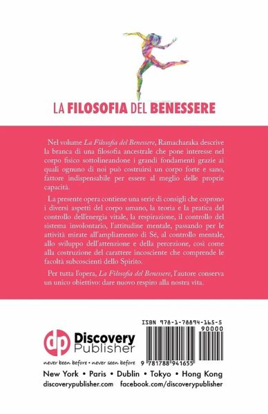 Nel volume La Filosofia del Benessere, Ramacharaka descrive la branca di una filosofia ancestrale che pone interesse nel corpo fisico sottolineandone i grandi fondamenti grazie ai quali ognuno di noi può costruirsi un corpo forte e sano, fattore indispensabile per essere al meglio delle proprie capacità. La presente opera contiene una serie di consigli che coprono i diversi aspetti del corpo umano, la teoria e la pratica del controllo dell'energia vitale, la respirazione, il controllo del sistema involontario, l'attitudine mentale, passando per le attività mirate all'ampliamento di Sé, al controllo mentale, allo sviluppo dell'attenzione e della percezione, così come alla costruzione del carattere incosciente che comprende le facoltà subcoscienti dello Spirito. Per tutta l'opera, La Filosofia del Benessere, l'autore conserva un unico obiettivo: dare nuovo respiro alla nostra vita.