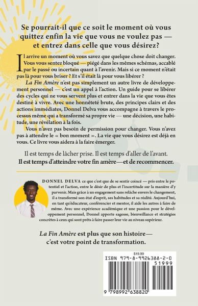La Fin Amère : Comment Laisser Derrière Soi l'Indésirable et Vivre la Vie Que Vous Voulez est votre guide pour transformer votre vie. Écrit par Donnel Delva, ce livre propose des étapes pratiques pour vous aider à vous libérer des schémas négatifs et à créer la vie dont vous avez toujours rêvé-une vie remplie de bonheur, d'abondance et de succès. À travers des conseils concrets, des stratégies applicables et des exercices de réflexion personnelle, Delva offre une feuille de route claire pour une transformation profonde. La Fin Amère vous apprend à comprendre votre état actuel, à définir votre état désiré et à prendre les mesures nécessaires pour un changement durable. Que vous vous sentiez bloqué, insatisfait de votre situation actuelle ou simplement prêt à passer au niveau supérieur, ce livre vous aidera à créer une vie pleine de sens et d'épanouissement. Avec des actions concrètes à mettre en place après chaque chapitre, vous pourrez appliquer immédiatement ce que vous apprenez.Points Clés : ¿ Un accompagnement étape par étape pour votre transformation personnelle. ¿ Des exercices pratiques pour clarifier vos objectifs. ¿ Des actions immédiates pour mettre en pratique vos apprentissages. ¿ Des exemples concrets pour vous inspirer et vous motiver. ¿ Des stratégies basées sur des recherches pour garantir leur efficacité. Si vous êtes prêt à laisser derrière vous ce qui ne vous sert plus et à embrasser un avenir plein de possibilités, La Fin Amère vous montrera comment y parvenir. Il est temps d'accepter le changement et de vivre la vie que vous méritez.