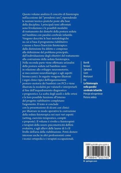 Questo volume analizza il concetto di fisioterapia come "prendersi cura" includendo le nozioni teorico pratiche alla base della disciplina fisioterapica nonché l'evoluzione e le possibili modalità di trattamento dei disturbi riguardanti la postura seduta. Dopo aver presentato il processo di maturazione e sviluppo della scienza riabilitativa che ha permesso di passare dal concetto della "cura del difetto" alla nuova mentalità del "prendersi cura", si analizzano le basi metodologiche su cui si costruisce il programma riabilitativo e l'esercizio fisioterapico: dalla diagnosi di difetto e compenso alla definizione del problema principale, dall'individuazione degli obiettivi di trattamento alla costruzione di una seduta fisioterapica. Nella seconda parte viene presentata un'analisi della postura seduta nel bambino sano riguardante lo sviluppo, i meccanismi neurofisiologici e gli aspetti biomeccanici ad esse sottese. Si affrontano successivamente e più dettagliatamente i segni clinici tipici manifestati nell'organizzazione posturo-motoria e manipolativa dei bambini con PC, e la modalità per valutarli ed interpretarli al fine di comprendere l'inquadramento diagnostico e prognostico relativo alla funzione in esame. Si presentano i principali ausili e ortesi utili al raggiungimento degli obiettivi riabilitativi che è possibile individuare. Si conclude con la presentazione di vari casi clinici a partire dai quali si affronta il processo di costruzione della seduta fisioterapica descrivendone alcune proposte concrete per il suo svolgimento.