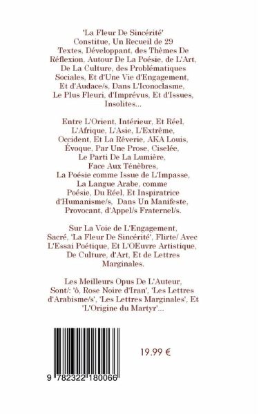 'La Fleur de Sincérité,Constitue Un Recueil de 29 Textes,Développant des Thèmes de Réflexion,Autour, de La Poésie, de L'Art,De La Culture, des Problématiques,Sociales, Et d'Une Vie d'Engagement,Et d'Audace/s, Dans L'IconoclasmeLe Plus Fleuri, d'Imprévus, Et d'IssuesInsolites...Entre L'Orient, Intérieur, Et Réel,L'Afrique, L'Asie,L'Extrême Occident,Et La Rêverie, AKA Louis, ÉvoquePar Une Prose, Ciselée,Le Parti de La Lumière,La Langue Arabe comme Poésie,Du Réel, Et Inspiratrice,d'Humanisme/s, Dans Un ManifesteProvocant d'Appel/s Fraternel/s.Sur La Voie de L'Engagement,Sacré, 'La Fleur de Sincérité',Flirte Avec L'Essai Poétique, EtL'OEuvre Artistique,De Culture d'Art, Et de LettresMarginales.AKA Louis, Est Poète Et Illustrateur,Auteur de Nombreux OpusPoétiques Sur Différents SupportsEt Médias.Les Ouvrages Majeurs de L'AuteurSont:'ô, Rose Noire d'Iran', 'Les Lettresd'Arabisme/s', 'Les Lettres Marginales',Et 'L'Origine du Martyr'...La Fleur de Sincérité, Est Le 2emeVolume de La Collection'Poésie Et Thèmes de Réflexion,Ou La Voie des Lettres Et des Versets'.Il Suit Le Volume 1 Intitulé'Les Lettres d'Arabisme/s'.