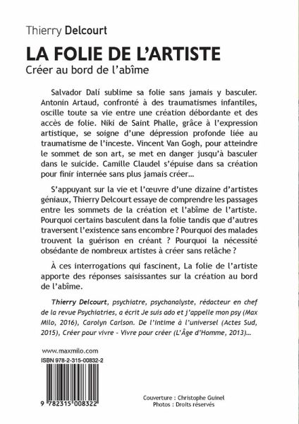 Salvador Dalí sublime sa folie sans jamais y basculer. Antonin Artaud, confronté à des traumatismes infantiles, oscille toute sa vie entre une création débordante et des accès de folie. Niki de Saint Phalle, grâce à l'expression artistique, se soigne d'une dépression profonde liée au traumatisme de l'inceste. Vincent Van Gogh, pour atteindre le sommet de son art, se met en danger jusqu'à basculer dans le suicide. Camille Claudel s'épuise dans sa création pour finir internée sans plus jamais créer...S'appuyant sur la vie et l'uvre d'une dizaine d'artistes géniaux, Thierry Delcourt essaye de comprendre les passages entre les sommets de la création et l'abîme de l'artiste. Pourquoi certains basculent dans la folie tandis que d'autres traversent l'existence sans encombre ? Pourquoi des malades trouvent la guérison en créant ? Pourquoi la nécessité obsédante de nombreux artistes à créer sans relâche ?À ces interrogations qui fascinent, La folie de l'artiste apporte des réponses saisissantes sur la création au bord de l'abîme.