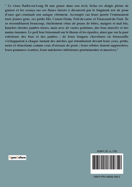 " Le vieux Barbe-en-Long fit une pause dans son récit, lécha ses doigts pleins de graisse et les essuya sur ses flancs laissés à découvert par le fragment usé de peau d¿ours qui constuait son unique vêtement. Accroupis sur leurs jarrets l¿entouraient trois jeunes gens, ses petits fils, Courre-Daim, Poil-de-carotte et Froussard-de-Nuit. Ils se ressemblaient beaucoup, chichement vêtus de peaux de bêtes, maigres et mal bâtis, hanches étroites jambes torses, mais avec de vastes poitrines, des bras musclés et des mains énormes. Le poil leur foisonnait sur le thorax et les épaules, ainsi que sur la peau extérieure des bras et des jambes ; de leurs longues chevelures en broussaille s¿échappaient à chaque instant des mèches qui retombaient devant leurs yeux, petits, noirs et étincelants comme ceux d¿oiseaux de proie ; leurs orbites étaient rapprochées, leurs pommettes écartées, leurs mâchoires inférieures proéminentes et massives."