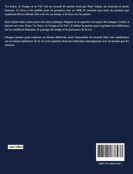 Dans "La Force", Paul Adam nous plonge dans les tumultes du changement français à travers les yeux de Bernard Héricourt, un jeune houzard. Le récit s'ouvre sur une scène de retraite de l'armée du Directoire, où Héricourt et ses compagnons, affamés et épuisés, se retrouvent face à des grenadiers autrichiens. La tension monte alors que les houzards, motivés par la faim, s'engagent dans une escarmouche pour s'emparer du pain des Autrichiens. Cette confrontation, bien que périlleuse, se solde par une victoire pour Héricourt, qui en retire une certaine gloire personnelle. De retour en France, Héricourt est confronté à une société en pleine mutation, où les idéaux changeants s'estompent face à la réalité économique et politique. Il retrouve sa famille en Artois, où les préoccupations matérielles et les évolutions personnelles prennent le pas sur les idéaux. Son beau-frère, Praxi-Blassans, incarne ce basculement, naviguant entre les vestiges de l'ancien régime et les opportunités offertes par le nouveau. À travers les interactions de Héricourt avec sa famille et ses rencontres, Paul Adam dépeint une époque de bouleversements, où les aspirations personnelles se heurtent aux réalités politiques et sociales. Le récit, mélange en détails historiques et psychologiques, offre une réflexion sur la quête de gloire et de reconnaissance dans un monde en pleine transformation.