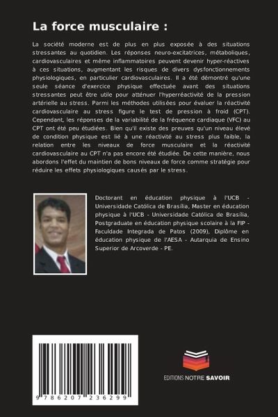 La société moderne est de plus en plus exposée à des situations stressantes au quotidien. Les réponses neuro-excitatrices, métaboliques, cardiovasculaires et même inflammatoires peuvent devenir hyper-réactives à ces situations, augmentant les risques de divers dysfonctionnements physiologiques, en particulier cardiovasculaires. Il a été démontré qu'une seule séance d'exercice physique effectuée avant des situations stressantes peut être utile pour atténuer l'hyperréactivité de la pression artérielle au stress. Parmi les méthodes utilisées pour évaluer la réactivité cardiovasculaire au stress figure le test de pression à froid (CPT). Cependant, les réponses de la variabilité de la fréquence cardiaque (VFC) au CPT ont été peu étudiées. Bien qu'il existe des preuves qu'un niveau élevé de condition physique est lié à une réactivité au stress plus faible, la relation entre les niveaux de force musculaire et la réactivité cardiovasculaire au CPT n'a pas encore été étudiée. De cette manière, nous abordons l'effet du maintien de bons niveaux de force comme stratégie pour réduire les effets physiologiques causés par le stress.