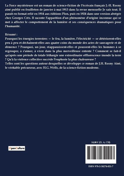 La Force mystérieuse est un roman de science-fiction de l'écrivain français J.-H. Rosny aîné publié en feuilleton de janvier à mai 1913 dans la revue mensuelle Je sais tout. Il paraît en format relié en 1914 aux éditions Plon, puis en 1924 dans une version abrégée chez Georges Crès. Il raconte l'apparition d'un phénomène d'origine inconnue qui se met à affecter le comportement de la lumière et ses conséquences dramatiques pour l'humanité. Résumé : Pourquoi les énergies terrestres ¿ le feu, la lumière, l'électricité ¿ se détériorent-elles peu à peu et déchaînent-elles aux quatre coins du monde des actes de sauvagerie et de démence ? Pourquoi, un jour, réapparaissent-elles et poussent-elles les hommes à se regrouper, à s'aimer, à vivre dans la plus merveilleuse entente ? Comment se fait-il qu'après une période de totale léthargie une extrordinaire efflorescence inonde la terre ? Qu'à la violence collective succède l'euphorie la plus chaleureuse ? Telles sont les questions autour desquelles se développe ce roman de J.H. Rosny Aîné, le véritable précurseur, avec H.G. Wells, de la science-fiction moderne.