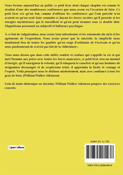 Nous livrons aujourd¿hui au public ce petit livre dont chaque chapitre est comme le résultat d¿une des nombreuses conférences que nous avons eu l¿occasion de faire. Ce petit livre n¿a qüun but, comme d¿ailleurs les conférences qui l¿ont précédé n¿en avaient eu qüun seul: faire connaître à chacun les forces secrètes qüil possède et les énergies mystérieuses qui le travaillent et qüon peut résumer sous ce double titre: Magnétisme personnel ou subjectif et Influence psychique. À ce but de vulgarisation, nous avons tout subordonné: et les ornements du style et les agréments de l¿exposition. Nous avons pensé que la sincérité, la simplicité nous tiendraient lieu de toutes les qualités qüon exige d¿ordinaire de l¿écrivain et qüon nous pardonnerait de n¿avoir pas fait de la «littérature». Nous nous disons que dans cette mêlée sombre et confuse qui s¿appelle la vie et qui met l¿homme aux prises avec toutes les forces mauvaises, ce petit livre sera un manuel d¿énergie, qüil enseignera la volonté, qüil éduquera le caractère et qüaux hommes de résignation découragée et de scepticisme triste, il apprendra la fierté, le courage et l¿espoir. Voilà pourquoi nous le dédions modestement, mais avec confiance à tous les gens de bien. (William Walker Atkinson) Loin de toute rhétorique ou doctrine, William Walker Atkinson propose des exercices concrets.