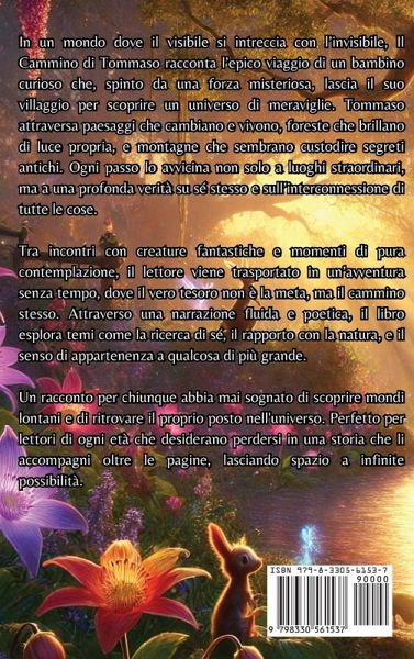 In un mondo dove il visibile si intreccia con l'invisibile, Il Cammino di Tommaso racconta l'epico viaggio di un bambino curioso che, spinto da una forza misteriosa, lascia il suo villaggio per scoprire un universo di meraviglie. Tommaso attraversa paesaggi che cambiano e vivono, foreste che brillano di luce propria, e montagne che sembrano custodire segreti antichi. Ogni passo lo avvicina non solo a luoghi straordinari, ma a una profonda verità su sé stesso e sull'interconnessione di tutte le cose. Tra incontri con creature fantastiche e momenti di pura contemplazione, il lettore viene trasportato in un'avventura senza tempo, dove il vero tesoro non è la meta, ma il cammino stesso. Attraverso una narrazione fluida e poetica, il libro esplora temi come la ricerca di sé, il rapporto con la natura, e il senso di appartenenza a qualcosa di più grande. Un racconto per chiunque abbia mai sognato di scoprire mondi lontani e di ritrovare il proprio posto nell'universo. Perfetto per lettori di ogni età che desiderano perdersi in una storia che li accompagni oltre le pagine, lasciando spazio a infinite possibilità.