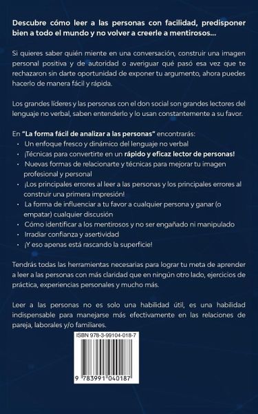 Aprende a leer a las personas, entender su lenguaje corporal y descubre lo que siempre te perdiste en las conversaciones! Descubre cómo leer a las personas con facilidad, predisponer bien a todo el mundo y no volver a creerle a mentirosos... Si quieres saber quién miente en una conversación, construir una imagen personal positiva y de autoridad o averiguar qué pasó esa vez que te rechazaron sin darte oportunidad de exponer tu argumento, ahora puedes hacerlo de manera fácil y rápida. Más del 70% de los mensajes comunicacionales son no verbales y se transmiten por la entonación o por el lenguaje corporal, develando lo que las personas realmente creen o piensan. Hoy todo se define por las relaciones interpersonales y el tiempo para hacer una primera impresión es cada vez más corto, por lo que conocer el lenguaje no verbal es la clave para causar buenas impresiones, avanzar profesional y socialmente, desenmascarar mentirosos y superar trabas sociales. ¡Y eso no tiene que ser difícil ni exclusivo de pocos expertos! Los grandes líderes y las personas con el don social son grandes lectores del lenguaje no verbal, saben entenderlo y lo usan constantemente a su favor. Sun Tzu, autor del famoso libro El arte de la guerra, dijo "las oportunidades se multiplican a medida que se aprovechan", ¡y ahora es tu oportunidad de adquirir una habilidad que te abrirá más puertas de las que puedes imaginar! No es necesario leer infinidad de libros ni asistir a costosos cursos... En "La forma fácil de analizar a las personas" encontrarás: Un enfoque fresco y dinámico del lenguaje no verbal ¡Técnicas para convertirte en un rápido y eficaz lector de personas! Nuevas formas de relacionarte y técnicas para mejorar tu imagen profesional y personal ¡Glosario fácil y ordenado de gestos, posturas y todo lo necesario para ser el mejor lector de lenguaje corporal de cualquier habitación! ¡Los principales errores al leer a las personas y los principales errores al construir una primera impresión! Las SEÑALES DE ADVERTENCIA para desenmascarar a una persona nociva y descubrir a distancia en quienes no debes confiar La forma de influenciar a tu favor a cualquier persona y ganar (o empatar) cualquier discusión Cómo identificar a los mentirosos y no ser engañado ni manipulado. Irradiar confianza y asertividad Y mucho, mucho más... Tendrás todas las herramientas necesarias para lograr tu meta de aprender a leer a las personas con más claridad que en ningún otro lado, ejercicios de práctica, experiencias personales y mucho más. Leer a las personas no es solo una habilidad útil, es una habilidad indispensable para manejarse más efectivamente en las relaciones de pareja, laborales y/o familiares. Si quieres aprovechar todas las oportunidades y aprender a leer a las personas de manera fácil y clara, desliza hacia abajo y haz clic en "Agregar al Carrito".