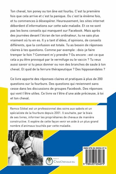Ton cheval, ton poney ou ton âne est fourbu. C'est la première fois que cela arrive et c'est la panique. Ou c'est la énième fois, et tu commences à désespérer. Heureusement, les sites internet débordent d'informations sur cette sale maladie. Et ce ne sont pas les bons conseils qui manquent sur Facebook. Mais après des journées devant l'écran de ton ordinateur, tu ne sais plus vraiment où tu en es. Il y a tant d'idées, d'opinions, de conseils différents, que la confusion est totale. Tu as besoin de réponses claires à tes questions. Comme par exemple : dois-je faire tremper le foin ? Comment m'y prendre ? Ou encore : est-ce que cela a pu être provoqué par le vermifuge ou le vaccin ? Tu veux aussi savoir si tu peux donner ou non des branches de saule à ton cheval. Et quid de la ferrure thérapeutique ? Des hipposandales ? Ce livre apporte des réponses claires et pratiques à plus de 200 questions sur la fourbure. Des questions qui reviennent sans cesse dans les discussions de groupes Facebook. Des réponses qui vont t'être utiles. Ce livre va t'être d'une aide précieuse, à toi et ton cheval.