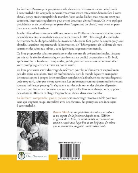 La fourbure. Beaucoup de propriétaires de chevaux se retrouvent un jour confrontés à cette maladie. Et lorsqu'elle survient, vous vous sentez totalement démuni face à votre cheval, poney ou âne incapable de marcher. Vous voulez l'aider, mais vous ne savez pas comment. Intervenir rapidement peut éviter beaucoup de souffrances. Ce livre explique précisément et en détail ce qui se passe dans l'organisme du cheval, juste avant et pendant une crise de fourbure. Les dernières découvertes scientifiques concernant l'influence des sucres, des hormones, des médicaments, des maladies sous-jacentes comme le DPIP (Cushing), des méthodes de traitement, des hipposandales, des toxines et du stress, font partie des sujets qui y sont abordés. L'extrême importance de l'alimentation, de l'hébergement, de la liberté de mouvement et des soins aux sabots y sont également largement commentés. Ce livre propose des solutions pratiques et des mesures de prévention simples. L'accent est mis sur le rôle fondamental que vous détenez, en qualité de propriétaire. En bref, après avoir lu La fourbure : comprendre, guérir, prévenir vous saurez comment aider votre protégé à guérir et à rester en bonne santé. Ce livre peut aussi servir d'ouvrage de référence pour les vétérinaires et les professionnels des soins aux sabots. Trop de professionnels, dans le monde équestre, manquent de connaissances à propos de ce problème complexe et la fourbure est souvent diagnostiquée trop tard, voire pas même reconnue. Les traitements communément utilisés restent souvent inefficaces parce qu'ils s'appuient sur des opinions et des théories dépassées, ou parce que l'on ne se concentre que sur les pieds. Ce livre veut changer cela, apporter des solutions efficaces et élargir l'approche au cheval dans son ensemble. La fourbure : comprendre, guérir, prévenir est un ouvrage incontournable pour tous ceux qui soignent ou qui travaillent avec des chevaux, des poneys ou des ânes sujets à cette maladie.