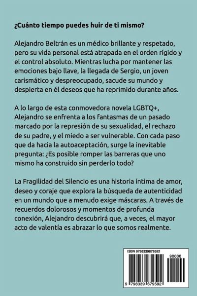 La Fragilidad del Silencio es una novela LGBTQ+ profundamente conmovedora que explora las tensiones entre el deseo, la identidad y el miedo. Alejandro Beltrán, un médico exitoso y perfeccionista, ha construido su vida sobre una base de control y orden, manteniendo ocultas las emociones que podrían desbordarlo. Pero cuando Sergio, un joven carismático y libre, llega a su vida, Alejandro comienza a cuestionar la vida que ha llevado y las decisiones que lo han mantenido alejado de su verdadero ser. A través de recuerdos de una adolescencia marcada por la represión de su sexualidad y la relación tensa con su padre, Alejandro lucha por reconciliar su identidad con los fantasmas del pasado. La creciente atracción hacia Sergio pone a prueba los muros que ha levantado para protegerse, obligándolo a confrontar su miedo a ser vulnerable y su anhelo por una vida auténtica. En esta intensa historia de autodescubrimiento, Thom Ramus entrelaza con maestría temas de represión emocional, aceptación personal y la búsqueda de amor en un mundo que puede ser implacable. La Fragilidad del Silencio es una poderosa novela LGBTQ+ que invita al lector a reflexionar sobre el peso del pasado y la libertad que surge cuando uno se atreve a abrazar su verdadera identidad.