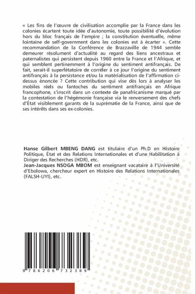 « Les fins de l'oeuvre de civilisation accomplie par la France dans les colonies écartent toute idée d'autonomie, toute possibilité d'évolution hors du bloc français de l'empire ; la constitution éventuelle, même lointaine de self-government dans les colonies est à écarter ». Cette recommandation de la Conférence de Brazzaville de 1944 semble demeurer résolument d'actualité au regard des liens ancestraux et paternalistes qui persistent depuis 1960 entre la France et l'Afrique, et qui semblent pertinemment à l'origine du sentiment antifrançais. De fait, serait-il superfétatoire de corréler à ce jour l'origine du sentiment antifrançais à la persistance et/ou la matérialisation de l'affirmation ci-dessus énoncée ? Cette contribution qui vise dès lors à analyser les mobiles réels ou fantoches du sentiment antifrançais en Afrique francophone, s'inscrit dans un contexte de panafricanisme marqué par la contestation de l'hégémonie française via le renversement des chefs d'État visiblement garants de la suprématie de la France, ainsi que de ses intérêts dans ses ex-colonies.