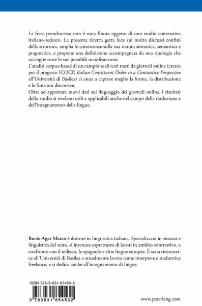 La frase pseudoscissa non è stata finora oggetto di uno studio contrastivo italiano-tedesco. La presente ricerca getta luce sui molto discussi confini della struttura, amplia le conoscenze sulla sua natura sintattica, semantica e pragmatica, e propone una definizione accompagnata da una tipologia che raccoglie tutte le sue possibili manifestazioni. L¿analisi corpus-based di un campione di testi tratti da giornali online (creato per il progetto ICOCP, Italian Constituent Order in a Contrastive Perspective all¿Università di Basilea) ci aiuta a capirne meglio la forma, la distribuzione e le funzioni discorsive. Oltre ad apportare nuovi dati sul linguaggio dei giornali online, i risultati dello studio si rivelano utili e applicabili anche nel campo della traduzione e dell¿insegnamento delle lingue.