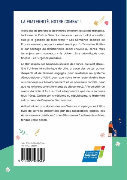 Alors que de profondes déchirures affectent la société française, l'adresse de Caïn à Dieu résonne avec une actualité nouvelle : suis-je le gardien de mon frère ? Les Semaines sociales de France veulent y répondre résolument par l'affirmative, fidèles à leur héritage du christianisme social chevillé au corps. Mais les enjeux sont nouveaux - ils doivent être décortiqués avec finesse - et l'urgence palpable.La 96e session des Semaines sociales de France a tracé des pistes autour d'experts et de témoins engagés, pour revitaliser un système démocratique affaibli, pour que notre terre reste vivable face aux menaces sur l'environnement et les nouveaux conflits, pour que les religions soient ferments de citoyenneté. Afin de bâtir un avenir durable, il faut surtout réapprendre que nous sommes tous frères. Qu'elle soit chrétienne ou républicaine, la fraternité est au coeur de l'enjeu du Bien commun.Articulant retranscription des conférences et aperçu des initiatives de terrain présentées par des associations locales, ces actes veulent contribuer à une réflexion aux fondements solides et tendue vers l'action.