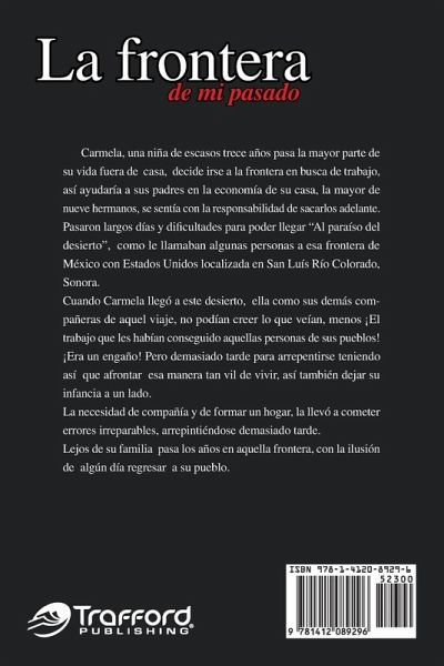 La niña de trece años, escuchaba a sus padres hablar de los planes que le tenían de casarla con un vegete del pueblo o irse a la frontera en busca de trabajo, ya que en el pueblo habían llegado los "señores" por las muchachas que quisieran ir a buscar fortuna. Ella como otras niñas del los pueblos cercanos decidieron irse, así ayudarían a los padres y a sus hermanos, jamás se imaginaron todas las situaciones tan amargas que pasarían en aquel lugar. Pasaban los años sin ir a su pueblo, las distancias eran muy largas el trabajo no se los permitía, era en los años cuarentas el trasporte era muy lento y poco. Carmela nunca imaginó de la manera tan vil que perdería a sus hermanitos, como el engaño de sus padres, sin importarles a estos nada de ella. Durante el tiempo que estuvo trabajando en el prostíbulo, tuvo algunos hijos los cuales se los iban quitando ya era costumbre que aquella mujer los cuidaria, lo mismo hacia con las demás para que siguieran trabajando sin ningún problema. Cuando quisieron recuperarlos fue demasiado tarde, pues fueron muchos años sin acordarse de que existían. En una ocasión quisieron cambiar de vida Carmela y sus amigas, cuando se dieron cuenta de lo fácil que era pasarse la frontera sin papeles, pasaban todas las madrugadas a trabajar en los campos de estados unidos. Se fue quedando sola en la vida, sus padres murieron de sus hermanas y hermanos no tenia ninguna razón, las amigas se casaron con muchachos que trabajaban en los campos y se fueron a vivir a estados unidos. Sola en aquel desierto, empezó a salir con un doctor de aquel lugar, casándose con el sin importarle la vida que le daría, ella lo único que le importaba era tener un hogar. Pasaron algunos años cuando creía que ya era todo lo que la vida le daría, cuando tuvo una gran sorpresa, que le cambio la existencia. La gran parte de su vida la paso en la frontera donde jamás pensó en regresar.