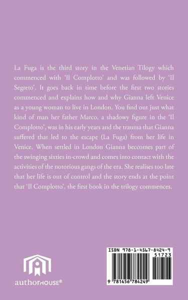 La Fuga is the third story in the Venetian Tilogy which commenced with 'Il Complotto' and was followed by 'Il Segreto'. It goes back in time before the first two stories commenced and explains how and why Gianna left Venice as a young woman to live in London. You find out just what kind of man her father Marco, a shadowy figure in the 'Il Complotto', was in his early years and the trauma that Gianna suffered that led to the escape (La Fuga) from her life in Venice. When settled in London Gianna beccomes part of the swinging sixties in-crowd and comes into contact with the activities of the notorious gangs of the era. She realises too late that her life is out of control and the story ends at thepoint that 'Il Complotto', the first book in the trilogy commences.
