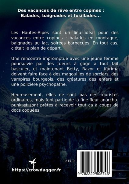 Des vacances de rêve entre copines : balades, baignades, et fusilladesLes Hautes-Alpes sont un lieu idéal pour des vacances entre copines : balades en montagne,baignades au lac, soirées barbecues. En tout cas, c'était le plan de départ. Une rencontre impromptue avec une jeune femme poursuivie par des tueurs à gage a tout fait basculer, et maintenant Betty, Razor et Karima doivent faire face à des magouilles de sorciers, des vampires bourgeois, des créatures des enfers et une policière psychopathe.Heureusement, elles ne sont pas des touristes ordinaires, mais font partie de la fine fleur anarcho-punk et sont prêtes à recevoir tout ça à coups de docs coquées.