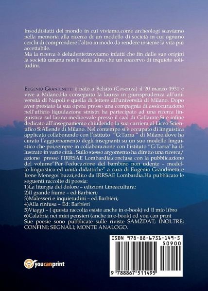 Insoddisfatti del mondo in cui viviamo,come archeologi scaviamo nella memoria alla ricerca di un modello di società in cui ognuno cerchi di comprendere l'altro in modo da rendere insieme la vita più accettabile. Ma la ricerca è deludente:troviamo infatti che fin dalle sue origini la società umana non è stata altro che un coacervo di inquiete solitudini.
