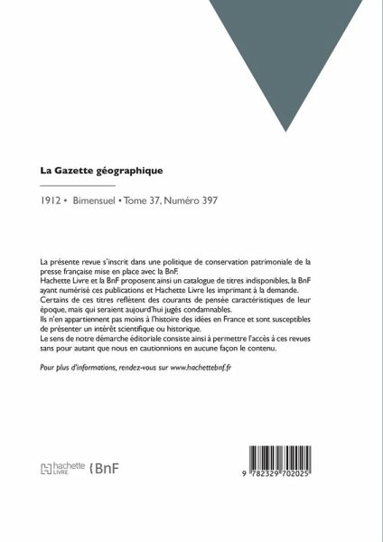 Revue française de l'étranger et des colonies et Exploration, Gazette géographique Date de l'édition originale: 1912 La présente revue s'inscrit dans une politique de conservation patrimoniale de la presse française mise en place avec la BnF. Hachette Livre et la BnF proposent ainsi un catalogue de titres indisponibles, la BnF ayant numérisé ces publications et Hachette Livre les imprimant à la demande. Certains de ces titres reflètent des courants de pensée caractéristiques de leur époque, mais qui seraient aujourd'hui jugés condamnables. Ils n'en appartiennent pas moins à l'histoire des idées en France et sont susceptibles de présenter un intérêt scientifique ou historique. Le sens de notre démarche éditoriale consiste ainsi à permettre l'accès à ces revues sans pour autant que nous en cautionnions en aucune façon le contenu. Pour plus d'informations, rendez-vous sur www.hachettebnf.fr
