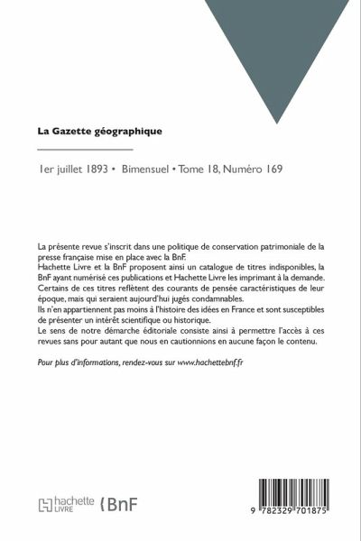 Revue française de l'étranger et des colonies et Exploration, Gazette géographique Date de l'édition originale: 1893-07-01 La présente revue s'inscrit dans une politique de conservation patrimoniale de la presse française mise en place avec la BnF. Hachette Livre et la BnF proposent ainsi un catalogue de titres indisponibles, la BnF ayant numérisé ces publications et Hachette Livre les imprimant à la demande. Certains de ces titres reflètent des courants de pensée caractéristiques de leur époque, mais qui seraient aujourd'hui jugés condamnables. Ils n'en appartiennent pas moins à l'histoire des idées en France et sont susceptibles de présenter un intérêt scientifique ou historique. Le sens de notre démarche éditoriale consiste ainsi à permettre l'accès à ces revues sans pour autant que nous en cautionnions en aucune façon le contenu. Pour plus d'informations, rendez-vous sur www.hachettebnf.fr
