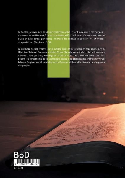 La Genèse, premier livre de l'Ancien Testament, offre un récit majestueux des origines du monde et de l'humanité selon la tradition judéo-chrétienne. Ce texte fondateur se divise en deux parties principales : l'histoire des origines (chapitres 1-11) et l'histoire des patriarches (chapitres 12-50). La première section s'ouvre sur le célèbre récit de la création en sept jours, suivi de l'histoire d'Adam et Ève dans le jardin d'Éden. Elle relate ensuite la chute de l'homme, le meurtre d'Abel par Caïn, le déluge et l'arche de Noé, puis la tour de Babel. Ces récits posent les fondements de la cosmologie biblique et abordent des thèmes universels tels que l'origine du mal, la relation entre l'homme et Dieu, et la diversité des langues et des peuples. La seconde partie se concentre sur l'histoire des patriarches hébreux : Abraham, Isaac, Jacob et Joseph. Elle narre l'alliance entre Dieu et Abraham, les péripéties de sa descendance, et culmine avec l'installation des Hébreux en Égypte sous la protection de Joseph. La Genèse établit les concepts clés de la théologie judéo-chrétienne : la création ex nihilo, le monothéisme, l'alliance divine, et l'élection d'Israël. Son style mêle narration épique, généalogies et dialogues, créant un texte riche en symbolisme et en profondeur spirituelle. Ce livre fondamental a profondément influencé la culture occidentale, inspirant d'innombrables oeuvres artistiques, littéraires et philosophiques à travers les siècles.