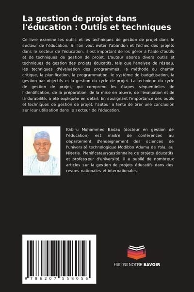 Ce livre examine les outils et les techniques de gestion de projet dans le secteur de l'éducation. Si l'on veut éviter l'abandon et l'échec des projets dans le secteur de l'éducation, il est important de les gérer à l'aide d'outils et de techniques de gestion de projet. L'auteur aborde divers outils et techniques de gestion des projets éducatifs, tels que l'analyse de réseau, les techniques d'évaluation des programmes, la méthode du chemin critique, la planification, la programmation, le système de budgétisation, la gestion par objectifs et la gestion du cycle de projet. La technique du cycle de gestion de projet, qui comprend les étapes séquentielles de l'identification, de la préparation, de la mise en oeuvre, de l'évaluation et de la durabilité, a été expliquée en détail. En soulignant l'importance des outils et techniques de gestion de projet, l'auteur a tenté de tirer une conclusion sur leur utilisation dans le secteur de l'éducation.