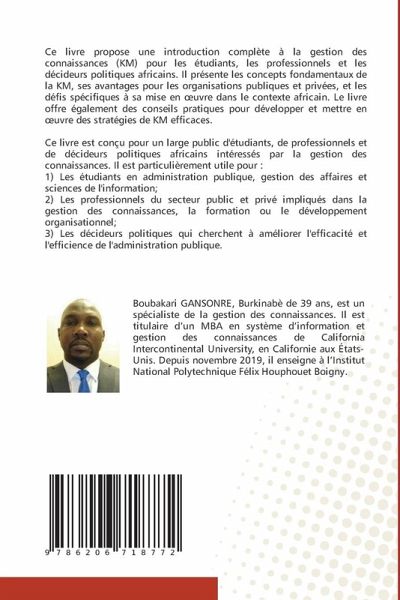 Ce livre propose une introduction complète à la gestion des connaissances (KM) pour les étudiants, les professionnels et les décideurs politiques africains. Il présente les concepts fondamentaux de la KM, ses avantages pour les organisations publiques et privées, et les défis spécifiques à sa mise en oeuvre dans le contexte africain. Le livre offre également des conseils pratiques pour développer et mettre en oeuvre des stratégies de KM efficaces.Ce livre est conçu pour un large public d'étudiants, de professionnels et de décideurs politiques africains intéressés par la gestion des connaissances. Il est particulièrement utile pour :1) Les étudiants en administration publique, gestion des affaires et sciences de l'information;2) Les professionnels du secteur public et privé impliqués dans la gestion des connaissances, la formation ou le développement organisationnel;3) Les décideurs politiques qui cherchent à améliorer l'efficacité et l'efficience de l'administration publique.