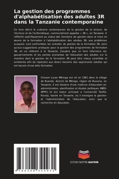Ce livre décrit le scénario contemporain de la gestion de la lecture, de l'écriture et de l'arithmétique, communément appelée « 3R », en Tanzanie. Il réfléchit spécifiquement au statut des fonctions de gestion dans la mise en oeuvre de la formation à l'alphabétisation des adultes 3R, aux problèmes auxquels sont confrontées les activités de gestion de la formation 3R, ainsi qu'aux suggestions pratiques pour la gestion des programmes de formation 3R, en se référant à la Tanzanie. J'espère que ce livre informera les gouvernements et les parties prenantes de l'éducation des adultes sur la manière dont la gestion de la formation 3R peut être mieux contrôlée et améliorée afin de répondre aux divers besoins des apprenants adultes qui ont besoin d'une telle formation.