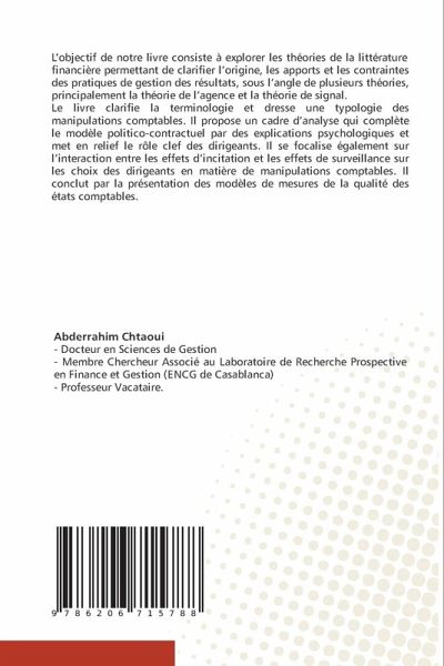 L'objectif de notre livre consiste à explorer les théories de la littérature financière permettant de clarifier l'origine, les apports et les contraintes des pratiques de gestion des résultats, sous l'angle de plusieurs théories, principalement la théorie de l'agence et la théorie de signal.Le livre clarifie la terminologie et dresse une typologie des manipulations comptables. Il propose un cadre d'analyse qui complète le modèle politico-contractuel par des explications psychologiques et met en relief le rôle clef des dirigeants. Il se focalise également sur l'interaction entre les effets d'incitation et les effets de surveillance sur les choix des dirigeants en matière de manipulations comptables. Il conclut par la présentation des modèles de mesures de la qualité des états comptables.