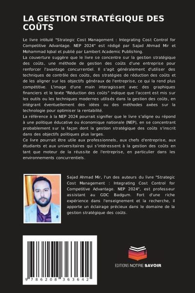 Le livre intitulé "Strategic Cost Management : Integrating Cost Control for Competitive Advantage. NEP 2024" est rédigé par Sajad Ahmad Mir et Mohammad Iqbal et publié par Lambert Academic Publishing.La couverture suggère que le livre se concentre sur la gestion stratégique des coûts, une méthode de gestion des coûts d'une entreprise pour renforcer l'avantage concurrentiel. Il s'agit généralement d'utiliser des techniques de contrôle des coûts, des stratégies de réduction des coûts et de les aligner sur les objectifs généraux de l'entreprise, ce qui la rend plus compétitive. L'image d'une main interagissant avec des graphiques financiers et le texte "Réduction des coûts" indique que l'accent est mis sur les outils ou les techniques modernes utilisés dans la gestion des coûts, en intégrant éventuellement des idées ou des méthodes axées sur la technologie pour optimiser la rentabilité.La référence à la NEP 2024 pourrait signifier que le livre s'aligne ou répond à une politique éducative ou économique nationale (NEP), en se concentrant probablement sur la façon dont la gestion stratégique des coûts s'inscrit dans des objectifs politiques plus larges.Ce livre pourrait être utile aux professionnels, aux chefs d'entreprise, aux étudiants et aux universitaires qui s'intéressent à la gestion des coûts en tant que moteur de la réussite de l'entreprise, en particulier dans les environnements concurrentiels.