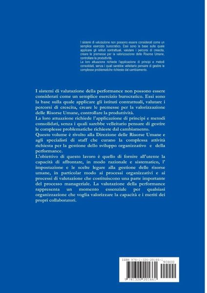 La Direzione delle Risorse Umane ha il compito di definire le politiche le procedure ed i metodi che da un lato assicurino l'efficienza dell'organizzazione e dall'altro la motivazione, l'impegno e la crescita costante degli individui che ne fanno parte. La valutazione della performance é uno strumento essenziale per lo sviluppo organizzativo e richiede uno sforzo progettuale e un adeguato sistema informativo, che in modo logico ed articolato consenta l'integrazione di metodologie complesse. Un tale sistema deve consentire l' omogeneità delle informazioni inserite, la comparabilità dei dati,il continuo aggiornamento nel tempo, perché la gestione delle Risorse Umane diventi uno strumento essenziale di crescita organizzativa e di sviluppo.Questo volume traccia il percorso e identifica le soluzioni operative le metodologie e gli strumenti necessari per il corretto sviluppo di un sistema di gestione della performance.