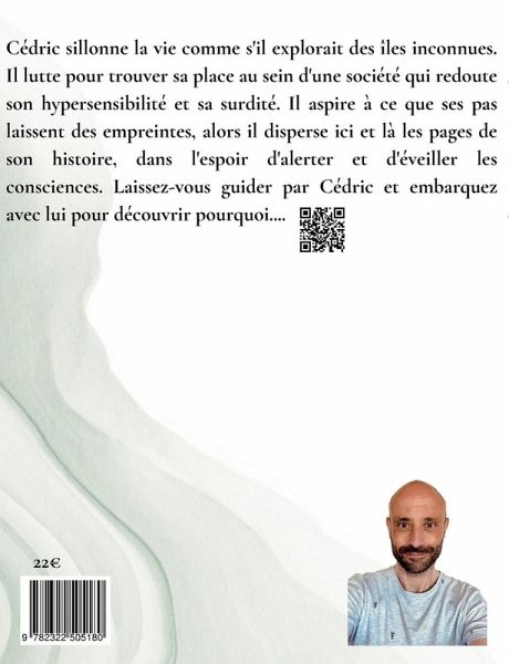 "Cédric sillonne la vie comme s'il explorait des îles inconnues. Il lutte pour trouver sa place au sein d'une société qui redoute son hypersensibilité et sa surdité. Il aspire à ce que ses pas laissent des empreintes, alors il disperse ici et là les pages de son histoire, dans l'espoir d'alerter et d'éveiller les consciences. Laissez-vous guider par Cédric et embarquez avec lui pour découvrir pourquoi"