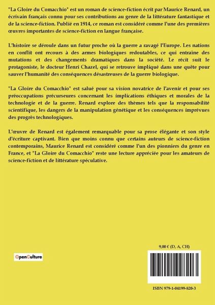 "La Gloire du Comacchio" est un roman de science-fiction écrit par Maurice Renard, un écrivain français connu pour ses contributions au genre de la littérature fantastique et de la science-fiction. Publié en 1914, ce roman est considéré comme l'une des premières ¿uvres importantes de science-fiction en langue française. L'histoire se déroule dans un futur proche où la guerre a ravagé l'Europe. Les nations en conflit ont recours à des armes biologiques redoutables, ce qui entraîne des mutations et des changements dramatiques dans la société. Le récit suit le protagoniste, le docteur Henri Chazel, qui se retrouve impliqué dans une quête pour sauver l'humanité des conséquences désastreuses de la guerre biologique. "La Gloire du Comacchio" est salué pour sa vision novatrice de l'avenir et pour ses préoccupations précurseures concernant les implications éthiques et morales de la technologie et de la guerre. Renard explore des thèmes tels que la responsabilité scientifique, les dangers de la manipulation génétique et les conséquences imprévues des progrès technologiques. L'¿uvre de Renard est également remarquable pour sa prose élégante et son style d'écriture captivant. Bien que moins connu que certains auteurs de science-fiction contemporains, Maurice Renard est considéré comme l'un des pionniers du genre en France, et "La Gloire du Comacchio" reste une lecture appréciée pour les amateurs de science-fiction et de littérature spéculative.
